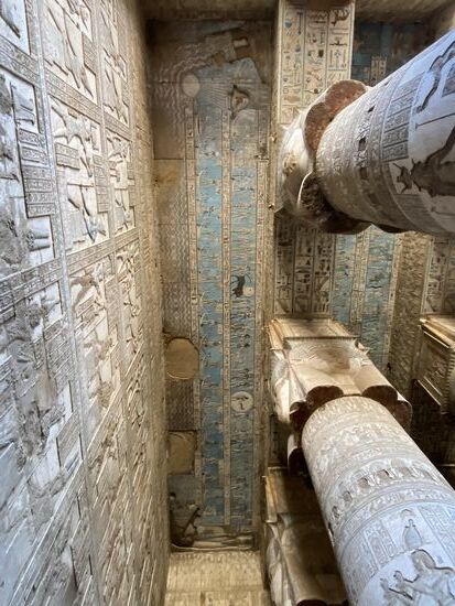 Er spiegelt mir was es bedeutet zu arbeiten und zu leben. Im inneren Frieden ohne Rast zieht sich die perpetuale Papyrusrolle auf seinen im Schneidersitz angewinkelten Oberschenkeln vorbei. Hieroglyphen in Kartuschen noch und nöcher gleich einem Sternenmeer unter dem Firmament der Zeitlosigkeit.