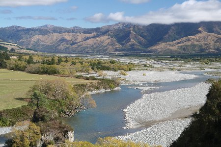 Tags drauf gings ueber ein schoenes und, wie zumeist in Neuseeland unglaublich breites Flussbett zu den Hanmer Springs.