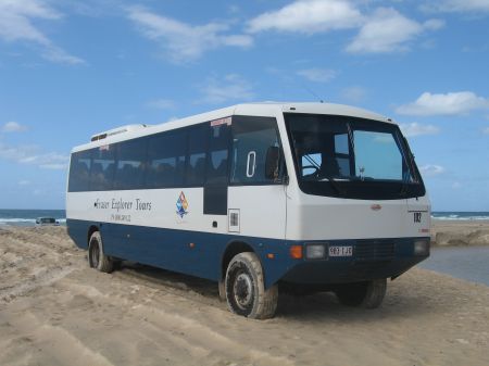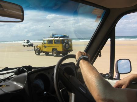Etwas noerdlich von Brisbane liegt Fraser Island vor der Ostkueste im Great Sandy National Park. Mit der Faehre verfrachteten wir uns samt Klettermaxe auf die weltgroesste Sandinsel. In diesem grossen Sandkasten fuer Erwachsene gehts neben dem Naturerlebnis unter anderem auch ums Offroad-fahren. Wir wollens mal als kleine Uebung fuers Outback sehen.