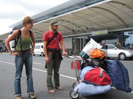 Mit Sack und Pack (carefully weighted) am Flughafen in Auckland