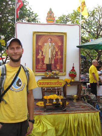 Muck ganz in den Farben des Koenigshauses gekleidet, vor einem der allgegenwaertigen Bildnisse des langdienenden thailaendischen Regenten