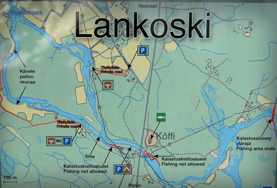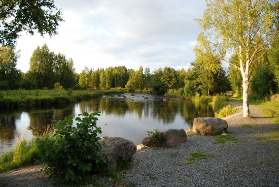 Wir fuhren weiter auf der Europastraße 8 an Pori vorbei. Einige Kilometer weiter kamen wir an eine Brücke über Stromschnellen, Långfors Bro. Wir sahen uns dort um und die alte Brücke an, die 1886-87 gebaut worden war. Hier gab es zu der Zeit auch ein Sägewerk und eine Papierfabrik. Der Parkplatz dort war uns zu dicht an der Hauptstraße, so suchten wir uns einen Übernachtungsplatz etwas weiter flußabwärts am Merikarvianjoki. Hier gab es viele Angelplätze mit Parkmöglichkeiten und Toaletten.