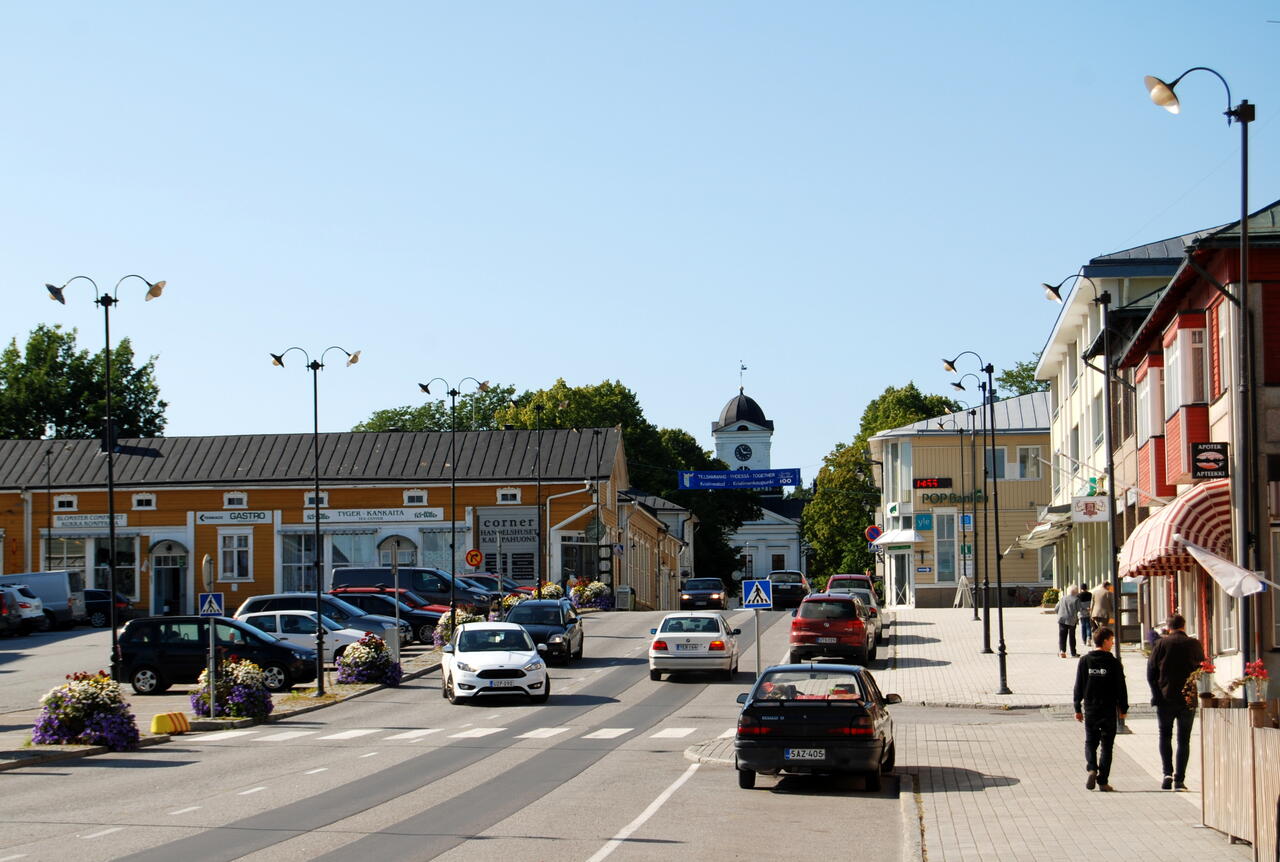 Einige Kilometer weiter in Richtung Norden erreichten wir den Abzweig nach Kristinestad. Die Stadt wurde 1649 von dem schwedischen Generalguvernör über Finland Per Brahe gegründet und nach seiner Frau benannt. Ca. 150 Jahre später wurde sie Handelsstadt, Handel und Seefahrt blühten auf. In den 1800er Jahren hatte Kristinestad eine der größten Handelsflotten des Landes. Nach einer kurzen Fahrstrecke von der Hauptstraße erreichten wir die über 150 Jahre alte 300 m lange Steinbrücke. Vor der Überfahrt hielten wir erst einmal an der dortigen Tankstelle und genossen den Blick auf die Stadt.