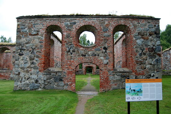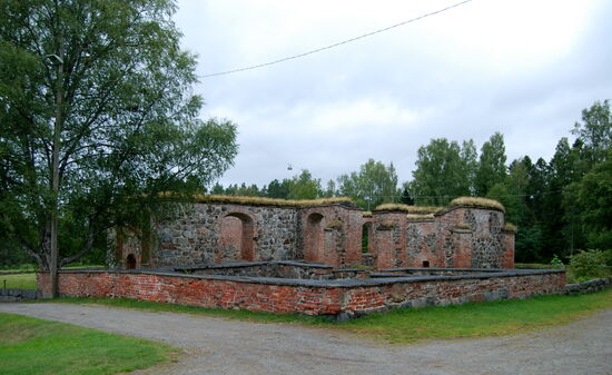 Am Parkplatz fanden wir gleich eine Informationstafel. Wir strolchten in den Ruinen herum. Beherrschend ist die Sankta Maria Steinkirche, die über die Jahre immer mehr ausgebaut worden war. Wir wanderten zwischen den Ruinen herum, die teilweise nur noch Steinhaufen waren. Manche Grundrisse kann man aber noch gut erkennen, wie z.B. die Trivialschule. So war es möglich für die niedrigen Stände, wie die Bürger der Stadt und die Bauern, eine Ausbildung zu bekommen und aufzusteigen. Sie nahm hier 1684 ihren Betrieb auf. Die erste Schule dieser Art gab es schon 1641 in Nykarleby.
