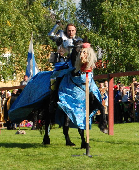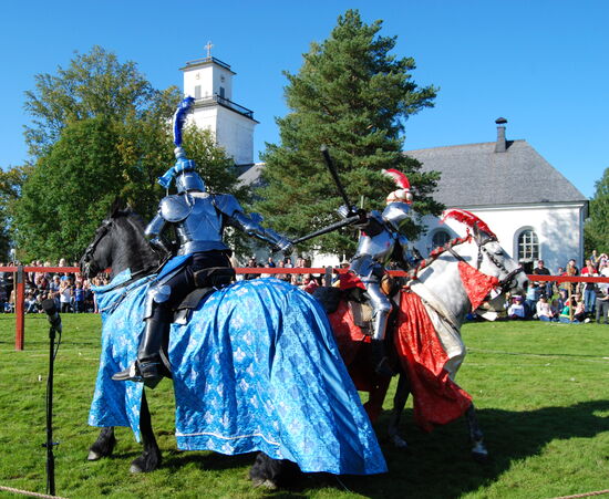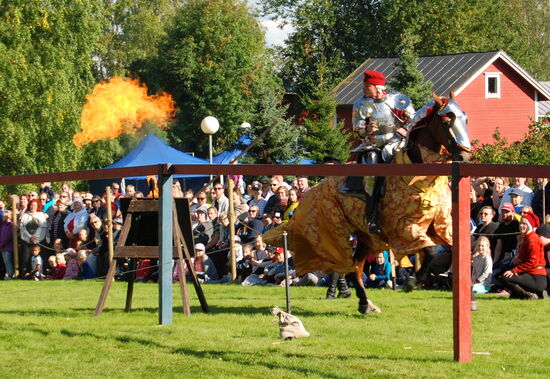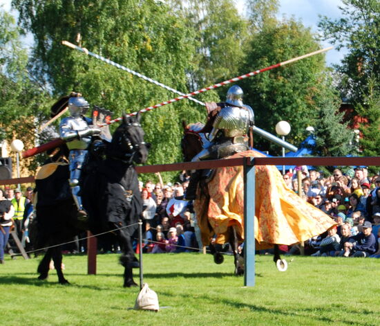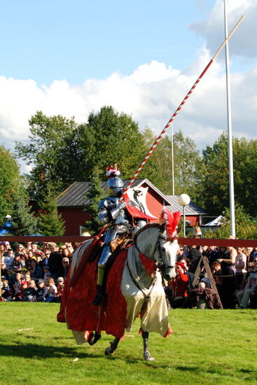 Wir machten noch einen Rundgang um und durch die Kirche, dann fingen die Ritterspiele an. Mit ihren geschmückten Pferden gingen die Ritter in ihren schimmernden Rüstungen mit den Lanzen aufeinander los.