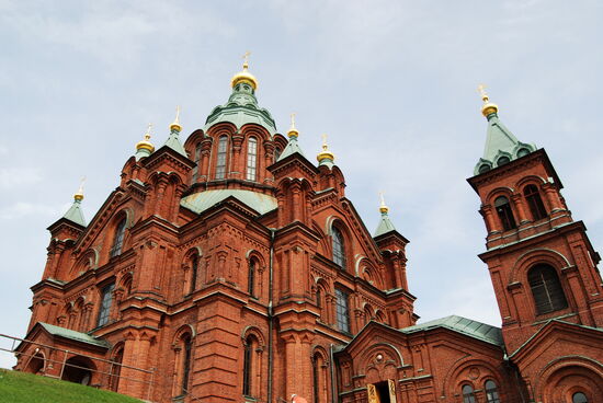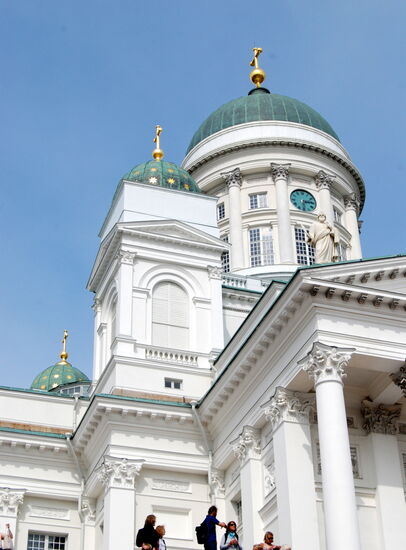 Nachdem wir die Prospekte studiert hatten, die wir an der Campingplatz-Rezeption bekommen hatten, machten wir uns auf den Weg in die Innenstadt. Es waren nur ein paar Schritte zur Metro-Station, wo wir uns eine 3-Tages-Karte kauften. Die Metro brachte uns zur Centralstation. Von dort schlenderten wir durch die Straßen, zuerst in Richtung Domkyrkan. Der Senatstorget quoll über von Touristen, die in ganzen Busladungen abgeladen wurden. Hier war auch ein Knotenpunkt der Straßenbahn. Alle Straßen der Umgebung waren mit den Fahrdrähten überspannt. Wir wanderten weiter in Richtung Uspenski-Kathedrale. An dem kleinen Kanal zwischen dem Nord- und dem Südhafen stießen wir auf das Feuerschiff Relandersgrund, das früher in den Schären vor Raumo lag und jetzt als Restaurangschiff verwendet wird. Die Kathedrale liegt recht malerisch auf einem Felsenhügel, und wir mußten viele Stufen hinauf klettern. Von hier oben konnten wir zu unserer Fähre hinübersehen, die noch im Südhafen lag. Nach einem Rundgang durch die prunkvolle orthodoxe Kirche gingen wir zum Marktplatz hinunter.