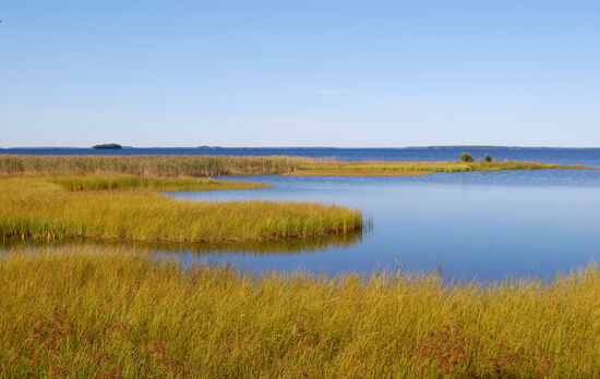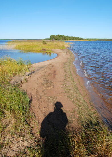 Der Oulujärvi mit der Insel Manamansalo gehört zum Geopark Rokua. Direkt am Campingplats begannen einige Wanderwege durch das Naturschutzgebiet. Wir wollten eine größere Wanderung zur nordöstlichen Landzunge Makkaraniemi machen. Ein kurzes Stück gingen wir zuerst über den Campingplats. Nachdem wir den Ablauf des Sees Teerilampi überquert hatten, führte der Weg direkt am Wasser entlang durch lichten Nadelwald. Bald hatten wir einen Grillplatz erreicht und machten eine kleine Pause. Die Küste fiel meist sandig und steil zum See hinab. Im Wald gab es viele Lingon – Preiselbeeren. Immer wieder hatten wir schöne Ausblicke auf den See mit einigen Inseln in der Ferne. Hier war es überall sehr sandig, die Überreste der Eiszeit. Bald hatten wir die Hütte an der Landspitze erreicht. Nach einer Pause, in der wir unsere mitgebrachten Brote aßen, ging Rainer allein auf die Landzunge. Christa ruhte sich ein bißchen länger aus.