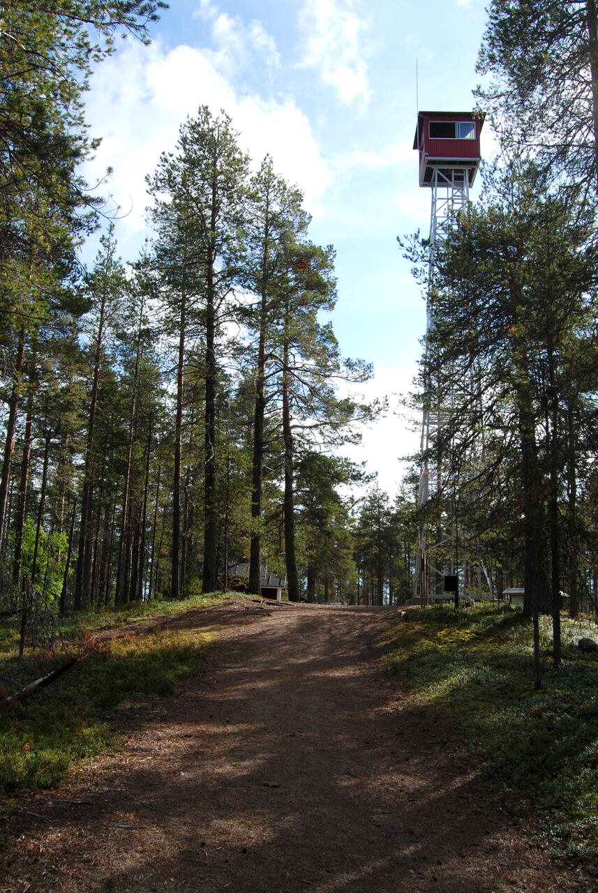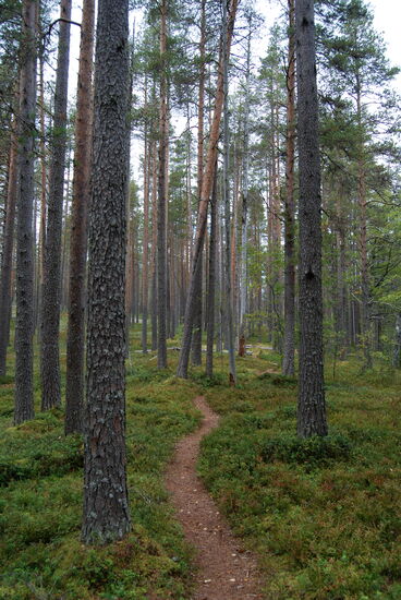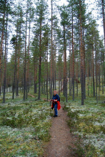 Schließlich erreichten wir einen Parkplatz, wo der Wanderweg begann. Auf sandigen Wegen ging es durch den lichten Wald. Der Boden war mit Rentierflechte bewachsen, aber auch mit Lingon – Preiselbeer- und Blåbär - Blaubeer-Büschen. Die Wege gingen auf und ab. Nach einem Anstieg erreichten wir den Aussichtsturm. Dort machten wir eine kleine Rast. Rainer stieg auf den Turm und genoß die Aussicht über die weite Waldlandschaft.