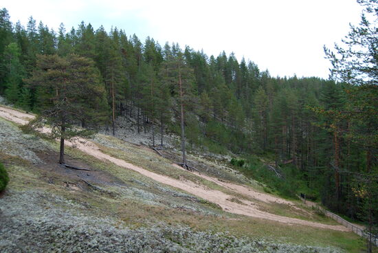 Der Weg führte am Hang entlang mit Blick ins Tal, wo es viele Toteislöcher gab. Am Ende des Tals stieg der Weg über eine Holztreppe neben einer großen Sandfläche wieder an. Auf der Höhe führte dann der Weg weiter durch den lichten Wald, bis er die Straße erreichte.