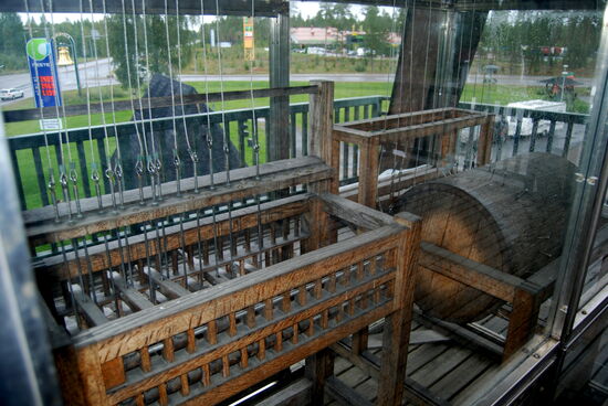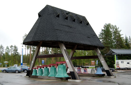 Nun ging es in Richtung Süden. Durch die Dünenlandschaft um Rokua fuhren wir zuerst zur 800. Dieser folgten wir bis Leskelä, wo wir auf die 4/ E75 abbogen. Unterwegs sahen wir hier auch immer wieder Getreidefelder. Das Wetter war aber sehr „durchwachsen“. Zeitweise regnete es stark. An der Kreuzung der 4 mit der 27 fiel uns eine Glocke bei einer Raststätte auf. Wir waren neugierig und fuhren auf den Parkplatz. Daneben war ein überdachtes Gestell aufgestellt. Darin waren in zwei Etagen Glocken in verschiedenen Größen aufgehängt. Ganz oben im Dach gab es ein Glockenspiel, bei dem man die Funktion studieren konnte. Auf dem Gelände waren noch viele verschiedene Glocken zu sehen. Auch in der Raststätte waren viele kleine Glocken ausgestellt. Allerdings haben wir nicht herausgefunden, was dahinter steckte.