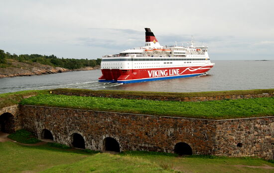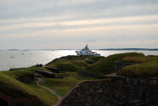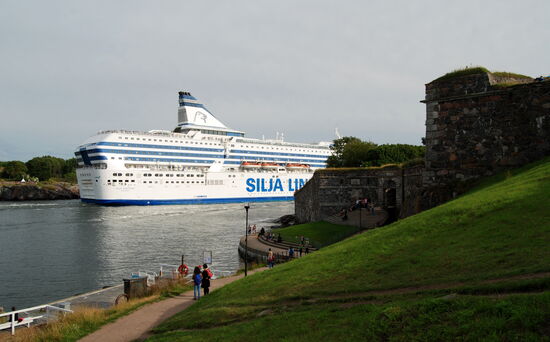 Wir folgten zunächst dem Hauptweg, erst als wir die Halbinsel Gustavssvärd erreicht hatten, schwenkten wir nach Osten zum Wasser hin. Da sahen wir auch schon unsere Fähre, die „Silja Serenade“, mit der wir vor zwei Tagen gekommen waren, ganz dicht an den Inseln vorbei zurück nach Stockholm fahren. Wir gingen parallel zum Wasser auf Kungsporten, dem Königstor, zu. Hier war in schwedischer Zeit der Hauptzugang zur Festung Sveaborg. Wir gingen durch das Tor in Richtung Restaurang Walhalla. Hier erreichten wir die Südspitze von Sveaborg, die Bastion Gustavssvärd. Durch den engen Sund fahren die großen Fährschiffe, wie auch gerade die „Gabriella“ der Viking-Line.