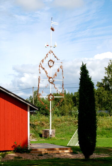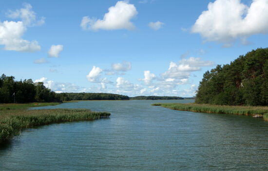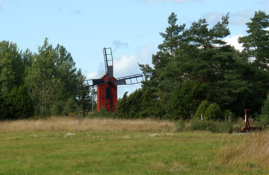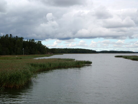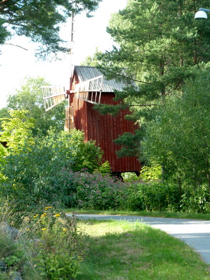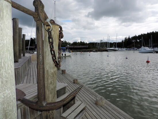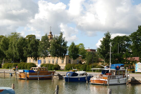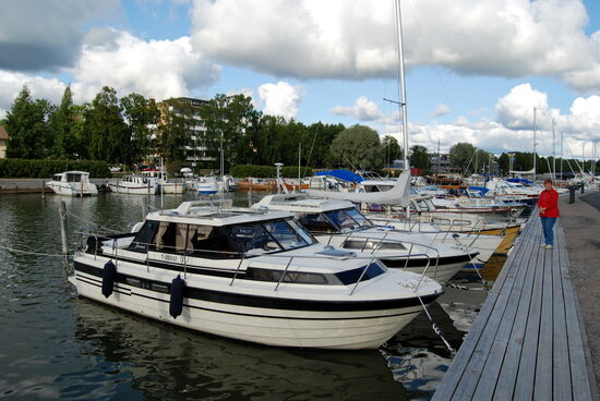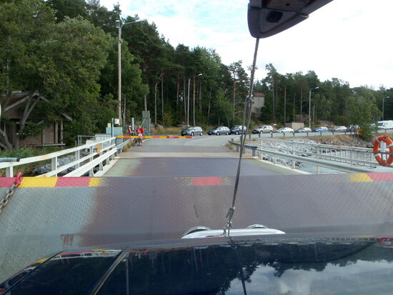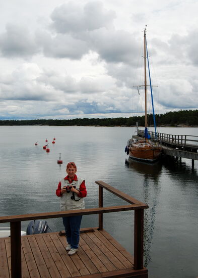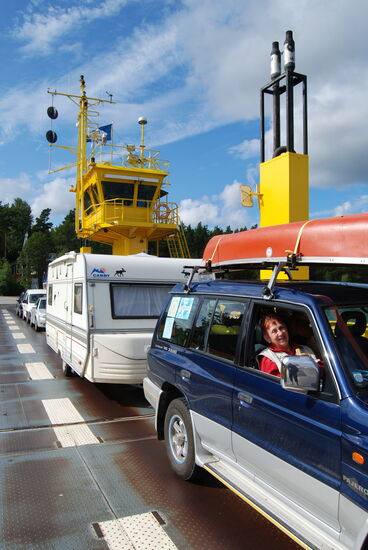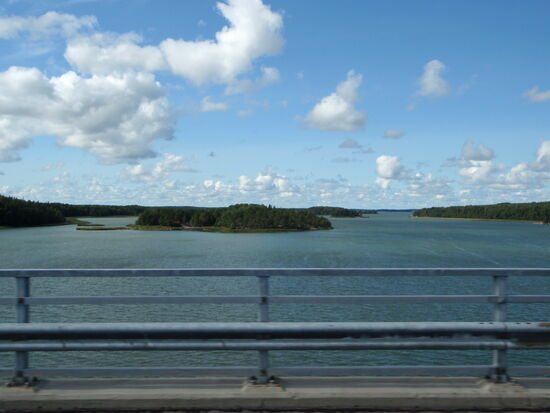 Wir wollten möglichst dicht an der Ostsee und den Schären entlang fahren. In Tövsala/Taivassalo mußten wir uns entscheiden, ob wir direkt in Richtung Norden weiterfuhren, oder noch einen Abstecher auf die Schären machten. Nachdem wir uns am Parkplatz neben der Straße den großen roten Granitblock angesehen hatten, machten wir noch einen Schwenk durch den Ort. Dabei kamen wir an der alten Feldsteinkirche vorbei, deren Turm auf der anderen Straßenseite stand. Wir entschlossen uns, über mehrere Brücken nach Gustavs/ Kustavi zu fahren, das seinen Namen nach Gustav III hat. Am Ortseingang trafen wir auf einige Stände, wo wir Gemüse und frisch geräucherten Lachs kauften. Ehe wir es uns versahen, waren wir auch schon auf der kostenlosen gelben Fähre, die uns zur nächsten Insel brachte. Wir fuhren bis zum Ende der Straße, wo eine weitere Fähre die Verbindung zu den Åland-Inseln aufrecht hält. Hier war auch ein Jachthafen, den wir uns ansahen. Dann fuhren wir mit einem kleinen Schwenk über die Insel zurück. Die gelbe Fähre brachte uns wieder nach Gustavs, wo wir dann wieder die Hauptstrecke verließen, über Nebenstrecken zu einem kleinen Hafen und dann weiter zur 192 zurück fuhren. Diesmal bogen wir in Tövsala auf die 196 ab und fuhren weiter in Richtung Norden. In Nystad/Uusikaupunki machten wir Rast in dem malerischen Hafen. Die Stadt wurde 1617 von Gustav II Adolf gegründet. Hier gibt es Finlands einzige Autofabrik, die ursprünglich von Saab gegründet worden war und für verschiedene Firmen wie Opel, Porsche bis hin zu Mercedes Fahrzeuge herstellt.