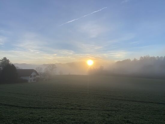 Es ist 10:15 Uhr, seit kurz vor acht bin ich unterwegs, gute 30 Kilometer habe ich in den Beinen, aber es läuft deutlich beschwerlicher auf den Straßen als gestern. Ich sitze auf einer Holzbank vor einer traumhaften Bergkulisse. Um über diese jedoch zufällig zu stolpern musste ich einen Umweg in Kauf nehmen. Ich schob das Reiserad einen matschigen Berg gerade so hinauf, nur mühsam Schritt für Schritt zurücklegen könnend. Den Blick allerdings wieder auf das Positive richtend waren die vergangenen zwei Stunden mit die schönsten auf dem Rad. Neben dem Donaudurchbruch und dem böhmischen Paradies in Tschechien versteht sich. Zauberhafte Nebelschleier bei knapp über null Grad Celsius, traumhafte Täler und sich durch kleine Gehöfte mäandrierende Bachläufe sind der unmögliche Versuch eine nicht beschreibbare Szenerie zu schildern. Irgendwann gegen neun Uhr stand dann die Sonne hinter einer Bergkuppe am Himmel, erstrahlte in ihrer ganzen Pracht und wuchs durch den Nebel zu einer goldenen Kugel an, die immer größer wurde. Ich stellte mir vor, dass dieses Licht den gesamten Raum einnimmt und jegliche Dunkelheit auflöste. Ich spürte es. An diesem Morgen war die Welt ein kleines wenig gereinigt und geheilt, sie erschien frischer und kostbarer.