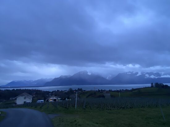 Ich sitze in Bruck bei ungefähr 70 Kilometern. Ich bin müde und vermeide es so gut es geht mich im Spiegel anzusehen. Der Grund hierfür ist das trotz kürzlichem Friseurbesuch äußerst zerzauste Haar unter der Mütze und dem Helm. Der erste Kaffee des Tages ist getrunken, der zweite wartet dampfend darauf, der oder das Croque Monsieur ist zu 50 Prozent gegessen. Mein Französisch darf wieder aktiviert werden. Die Bedienung strahlt, vermutlich weil ich den Altersdurchschnitt um rund 361 Prozent senke. Marginal gedankenverloren wird mein Blick von dem von weißen Schleiern umwundenen Schloß Gruyerz angezogen. Ein wenig komme ich mir hier gestrandet vor wie der Außerirdische in Matt Haigs Roman „Ich und die Menschen“. Alles hat sich verändert. Alles befindet sich kontinuierlich in der Veränderung. Ich habe keine Motivation mehr weiterzufahren. Auch wenn ich jetzt aufgewärmt und gestärkt bin. Es ist eine besondere Gegend hier. Aber heute Abend am Ufer des Genfer Sees einen Spaziergang zu unternehmen kann auch nicht verkehrt sein als kleiner Motivationsweitwurf.