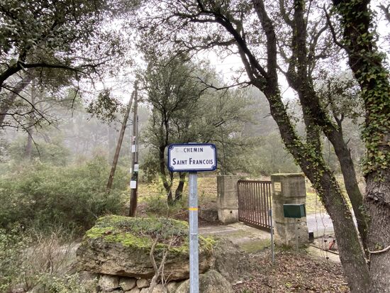 75,9 km verbleiben. Ich habe das zweite Pain au Chocolate gegessen und befinde mich nun auf dem CHEMIN SAINT FRANCOIS. Wieder mache ich mir bewusst, dass es im Prinzip nicht darum geht meine persönliche Tour de France abzuhalten und für mich in Marseille aller Voraussicht nach kein Begrüßungskomitee mit Champagner und Blumenstrauß auf mich wartet. Ich stehe an einer Lichtung, der Nebel liegt immer noch über der Natur, vermutlich wird er sich den gesamten Tag nicht lösen. Ich werde mir gewahr, dass ich die Pilgermuschel bei mir trage, die mir damals der Italiener zwischen Breslau und Zgorzelec überreicht hat. Er selbst hatte sie von einem Freund geschenkt bekommen und lange Zeit in seinem Zimmer hängen bevor er sie tatsächlich nutzte. Nun ist er des Öfteren mit seiner polnischen Freundin in Richtung Santiago de Compostela unterwegs. Ich schob einen Abschnitt in diesem Teil der Etappe, der definitiv der schönste der gesamten Tour ist. Es ist ein traumhafter Wald mit Pinien, ziemlich verwunschen und verzaubert. Und er ist ausgesprochen still. Einzig die Vögel zwitschern. Ich bin ein wenig glücklich und berührt. Marginal erinnert mich diese Lichtung an die Naturschutzgebiete im Osten von Hamburg, die Pinien an den Abschnitt an der Atlantikküste irgendwo zwischen Soulac-sur-Mer und Lacanau-Océan.