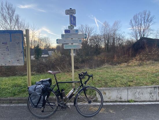 Die Zugfahrt im TGV von Marseille-Saint-Charles bis nach Mulhouse auf Sitzplatz Nr. 26 am Fenster mit Klapptisch war pünktlich und unspektakulär, mir verbleiben noch 28 Seiten im Beethoven-Notizbuch zu füllen. Mit Rückenwind hechelte ich selbstbewusst einer Gruppe Rennradfahrenden westlich des Rheins gen Süden hinterher, freilich überholte ich sie wieder, weil sie an einem Picknick-Platz Pause machten. In Huningue / Weil am Rhein, wo ich exakt 13.543 Minuten zuvor noch im alten Jahr in der Dunkelheit stand das Rad vor der Dreiländerbrücke zu fotografieren stehe ich nun in der Spätsonne und dem Marseillaise-Pullover. Als einer von einer Million jährlich querte ich sie. Die 47 Kilometer (nach der Zugfahrt) an diesem Tag verhelfen mir zu insgesamt rund 666 Kilometern / 414 Meilen oder 133.200 Pedalumdrehungen. Im Prinzip bedeutungslos wenn man bedenkt, dass das menschliche Herz rund 100.000 Schläge je 24 Stunden hat und ein jeder Schlag einmalig ist.