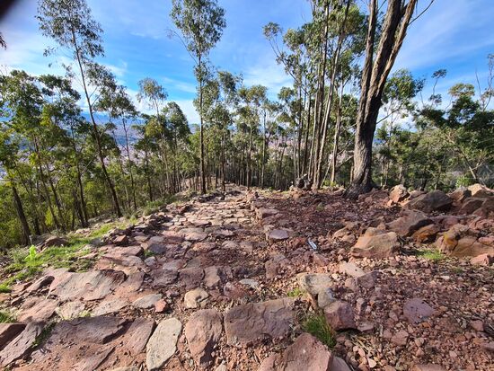 Ich laufe also auf eigene Faust den beschwerlichen Weg zum Monument auf dem Hausberg, teils auf Natursteinpflasterstraße, teils, abkürzend, einen wohl uralten Pilgerpfad mit steilen Natursteinstufen.