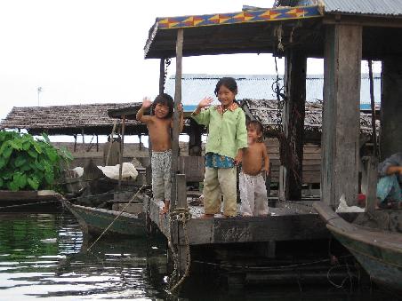 Als wir das offene Wasser erreichten, befand sich ein schwimmendes Haus neben dem anderen. Zwischen den Hütten mit Rumpf bewegten junge Mädchen mit den bekannten kegelförmigen Hüten ihre Boote durch die engen Wasserwege zwischen den Wohnobjekten. Voll beladen mit Früchten oder Textilien paddelten sie auf Kundenfang. Viele dieser Boote waren richtige Warenhäuser wie man sie hier im Land überall findet. Es ähnelte ein wenig einem Drive In, als wir an einem dieser Boote hielten, um meinen Zigarettenbedarf zu stillen. Alles, wirklich alles, war in dieser Siedlung zu finden. Schulen, Pagoden, Kirchen, kleine Handwerksladen und Wohnhäuser wechselten einander ab. Dem Fischer war es offensichtlich ein Anliegen uns mitzuteilen, dass die meisten der Bewohner den "Yhoun" (Vietnamesen) angehörten. Es war unübersehbar, dass sich hier alles um die Fischereien drehte. Unter anderem zeigte uns der Fährmann einen großen Käfig, in dem sich zahlreiche Krokodile befanden. Als machte es keinen Unterschied, ob man auf dem Wasser oder auf dem Festland sei, gingen die Menschen hier ihrem Schaffen nach. Auffallend waren die Kinder, die unentwegt lächelten und winkten, jedoch meist nur im Wasser zu beobachten waren. Die Siedlung umfasste nach Aussage unseres Führers ca. 1500 Objekte. Die meisten Yhoun wurden in der Zeit von Pol Pot aus dem Land vertrieben oder umgebracht. Heute noch verweigert man ihnen das immigrieren in das Land. Viele von ihnen schaffen es über Wasserwege das Landesinnere zu erreichen und verbringen hier über Generationen ihr Leben auf dem Wasser. Eine der beeindruckensten Siedlungsarten, die ich je gesehen habe.