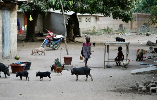 Dawda nimmt das behinderte Mädel auf den Arm und albert mit ihr rum—er hat ein großes Herz. Die Mutter war Kräuter sammeln und will diese zum Markt bringen. Sie ist wirklich schwer beladen