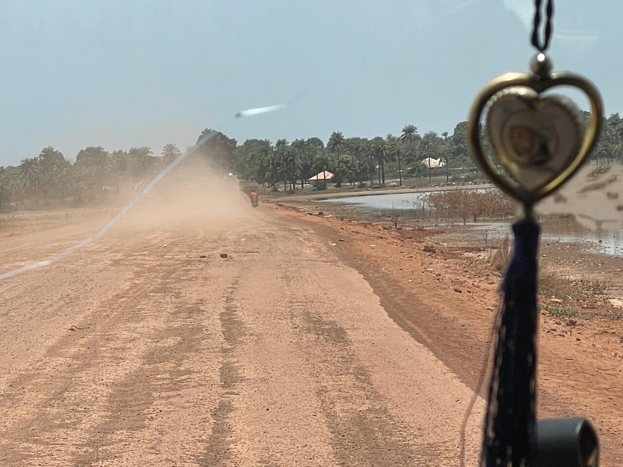Die Strecke von Ziguinchor bis zur gambischen Grenze ist noch mal ganz schlimm—man kann hier nur undeutlich sehen, wie tief die Schlaglöcher sind. Wir brauchen für die 70km fast 2 Stunden!