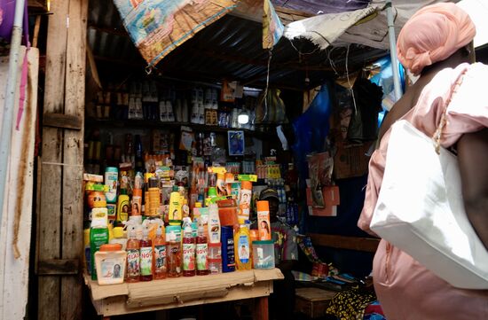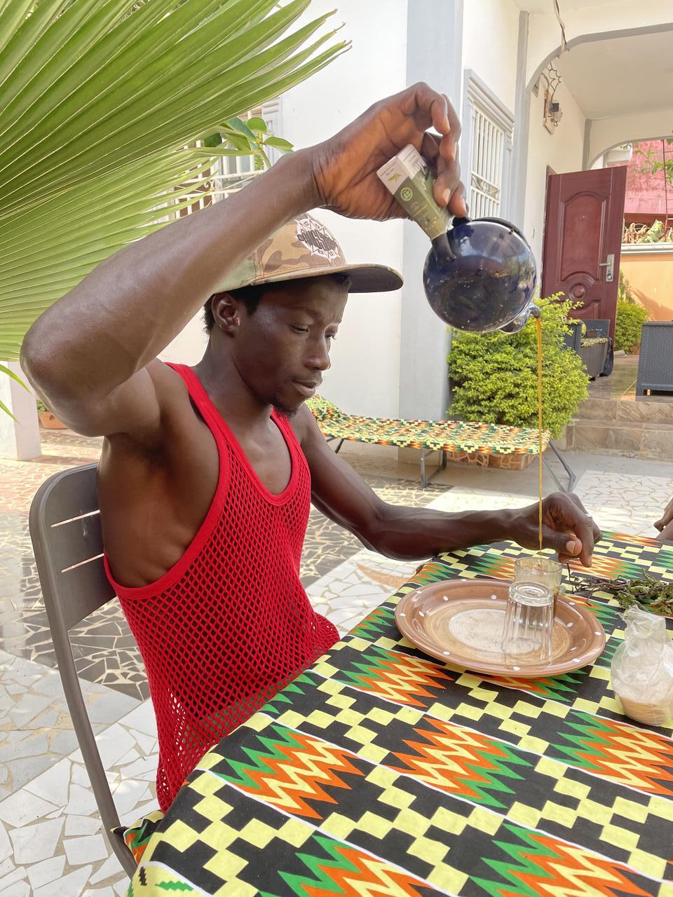 Dawda steuert als erstes einen Stoffladen an. Er erzählt, dass er für 2 Stühle noch Stoff benötigt …