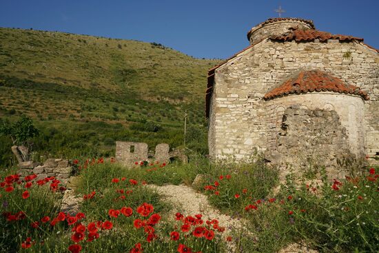 Ich wache auf in einem Blumenmeer aus Klatschmohn, verschiedenen Diestelarten, Malven, mediteranen Katzenöhrchen und tausenden mehr. Die Sonne scheint hell in unsere Zeltdach hinein. Wir stehen vor den Resten einer uralten Kirche. Es waren wohl mehrere Gebäude, so dass wir annehmen, dass es sich um ein altes Kloster gehandelt haben wird. Die Kirche hat man in den letzten Jahren nach ihrem alten Vorbild wieder aufgebaut. Ein kleines Gebäude auf einem Felsvorsprung über dem Tal.