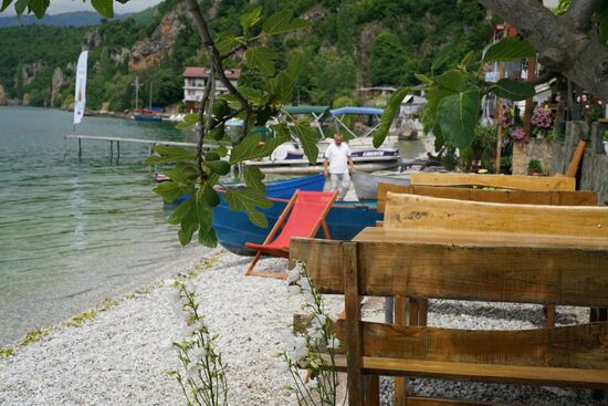Schnell haben wir die 5 Euro Nationalparksgebühr verschmerzt. Wir gelangen am Fuße des Berges nach Trpejča, einem kleinen hübsch renovierten Ort, dessen Straßen aus Treppen bestehen, die zwischen den Dächern immer tiefer bis ans glasklare Wasser führen. Wir sind am Ohridsee angekommen. Es ist wieder sommerlich warm, ja geradezu heiß hier unten. Der ganze, palmenbestandene Stand aus grobem Kies, die Restaurants, die auf Pfählen über dem See schweben, die ordentlich renovierten Pensionshäuschen, die überbordend blühenden Rosen, die Berge im Hintergrund . . . all das erinnert uns etwas an den Gardasee, nur eben sehr viel günstiger.
