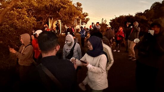 Die Sonne geht pünktlich auf, aber das ist kein Sonnenaufgang, der uns von den Füßen reißt. Wir finden die Vulkane im Nebel viel spannender.