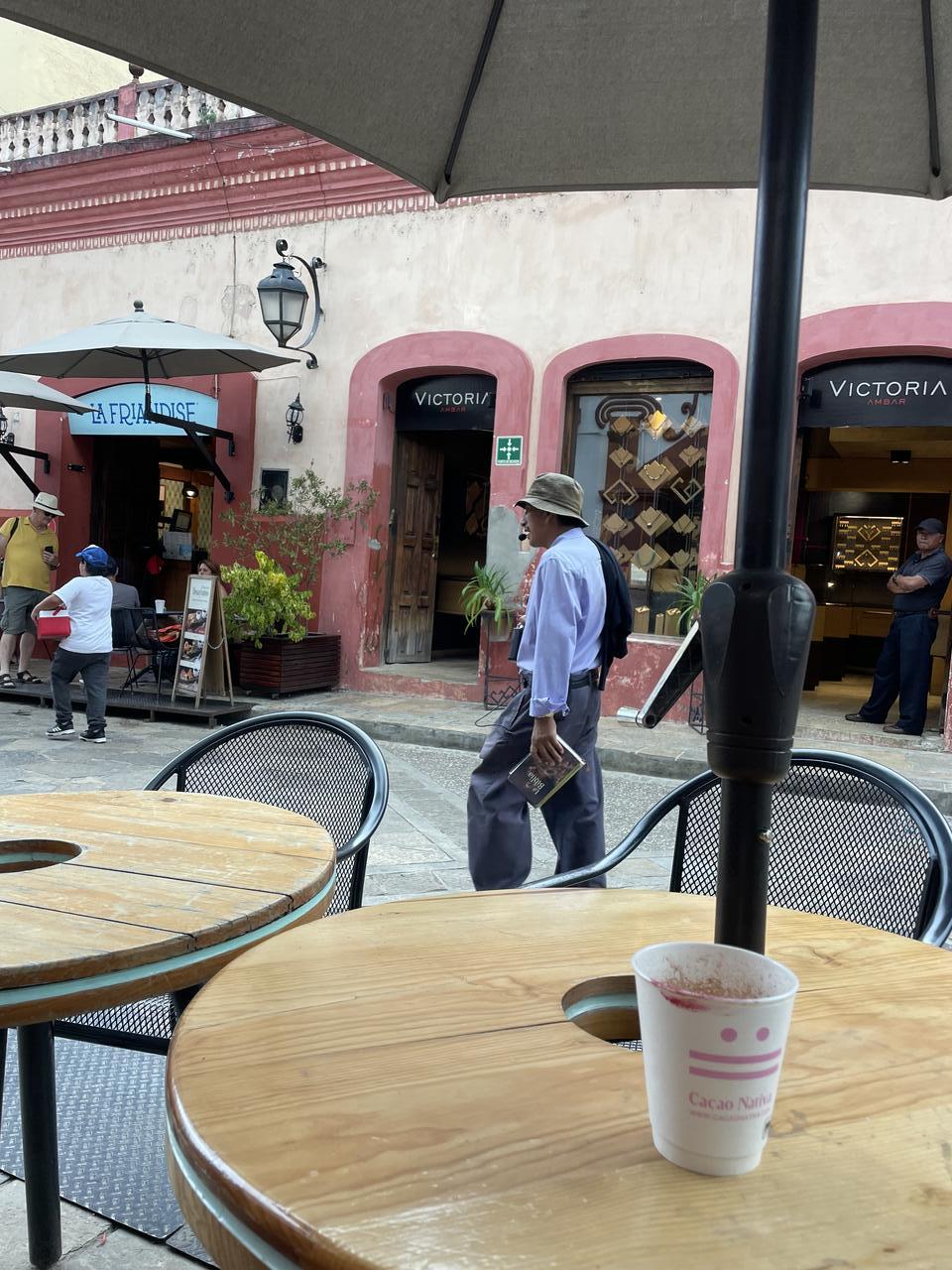 Ich setze mich in eine Cafeteria, oder eher eine Chocolateria. Es scheint, dass Schokolade hier wichtiger ist, als Kaffee, Jedenfalls gibt es sehr viele Angebote, darum setze ich mich erst einmal mit einer heissen Schokolade hin und beobachte die Strasse. Dass es extrem viele Strassenverkäufer hat, merke ich erst, als mich meine Schwester während unseres langen Telefongesprächs fragt, warum ich eigentlich dauernd No, Gracias sage. Ja, sie sind aufdringlich, lassen sich nicht beeindrucken, wenn jemand am Telefonieren oder in einem Gespräch ist.