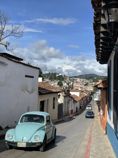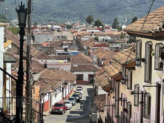 San Cristobal de las casas liegt auf gut 2000 m eingebettet zwischen grünen Hügeln.