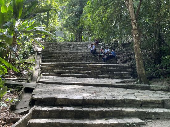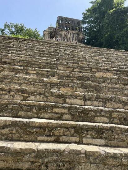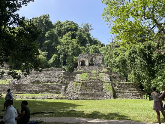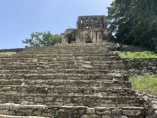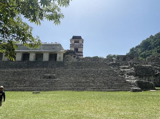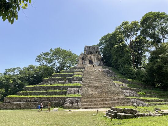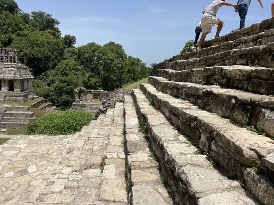 Übere eine hohe Treppe betreten wir den Berich mit den ausgegrabenen Pyramiden. Die Stadt muss einmal sehr gross und reich gewesen sein. Man hat lückenlose Beweise für die Existens vieler Herrscher gefunden, die zwischen 400 und 800 vor Christus hier regiert haben. Nach 800 verschwindet der letzte Herrscher und die Stadt wird verlassen. Was genau der Grund dazu war, ist noch nicht bekannt. So wie auch die anderen Maya-Städten in Tikal, Guatemala und Copan, Honduras, weiss man nicht viel über den Untergang der Maya-Städten. Doch die Mayas sind nicht ausgestorben, sie leben noch heute in den Einwohnern von Chiapas weiter.