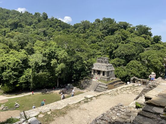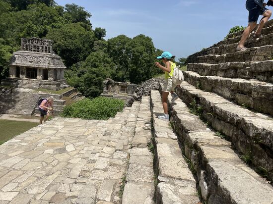 El Conde darf bestiegen werden. Jorge bleibt unten, während ich mich auf den Weg mache. 73 hohe Stufen führen hinauf bis zur Plattform mit dem Raum. Natürlich ist er mit Gittern abgeschlossen, denn dahiter befindet sich eine grosse Steintafel mit Inschriften. Ich geniesse den Rundblick auf die anderen Pyramiden, auch die Menschen, die tief unter über den Platz laufen, auf Jorge, den ich im Schatten der hohen Bäume kaum erkennen kann und auf die anderen Menschen, die sich noch auf dem Aufstieg befinden. Maya-Treppen sind anstrengend, denn die Stufen sind hoch, und manchmal schmal, so dass man ganz schnell auf Höhe gewinnt.