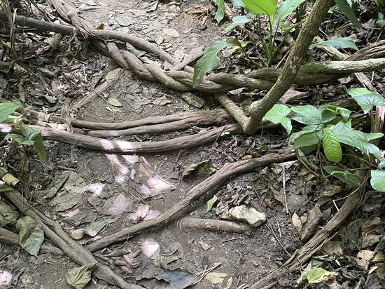Für den Rückweg wählen wir den Weg durch den Dschungel. Auch wenn da ein Schild steht: betreten verboten. Mit mir darfst du da durchgehen, wir kommen so durch einen kleinen Teil des Dschungels, der noch immer rund um die Ausgrabungen steht, lächelt Jorge. Pass nur auf, wenn sich eine dieser Wurzeln bewegen sollte...
