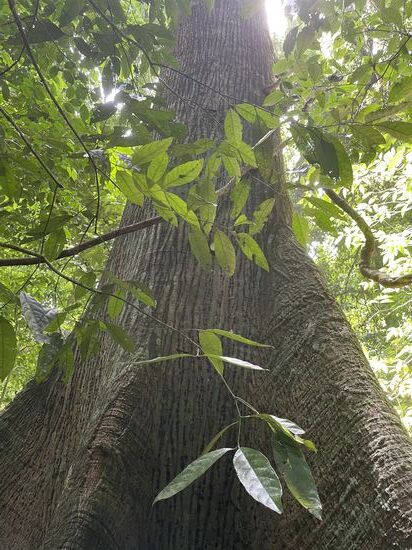Der Baum ist eine Caoba, sein Holz wird Mahagony genannt und vor allem im Schiffbau und für wertvolle Möbel eingesetzt. Man kann die rote Farbe unter der Rinde erkennen. Jorge kennt sich aus.