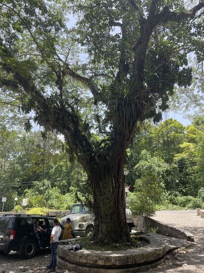 Es hat sich keine bewegt, aber wir begegnen einer Ceiba. Die Ceiba ist der Nationalbum Guatemalas, ein Kapockbaum. Seine breiten dicken Äste breiten sich erst ganz oben am Stamm so richtig in alle Richtungen aus.
