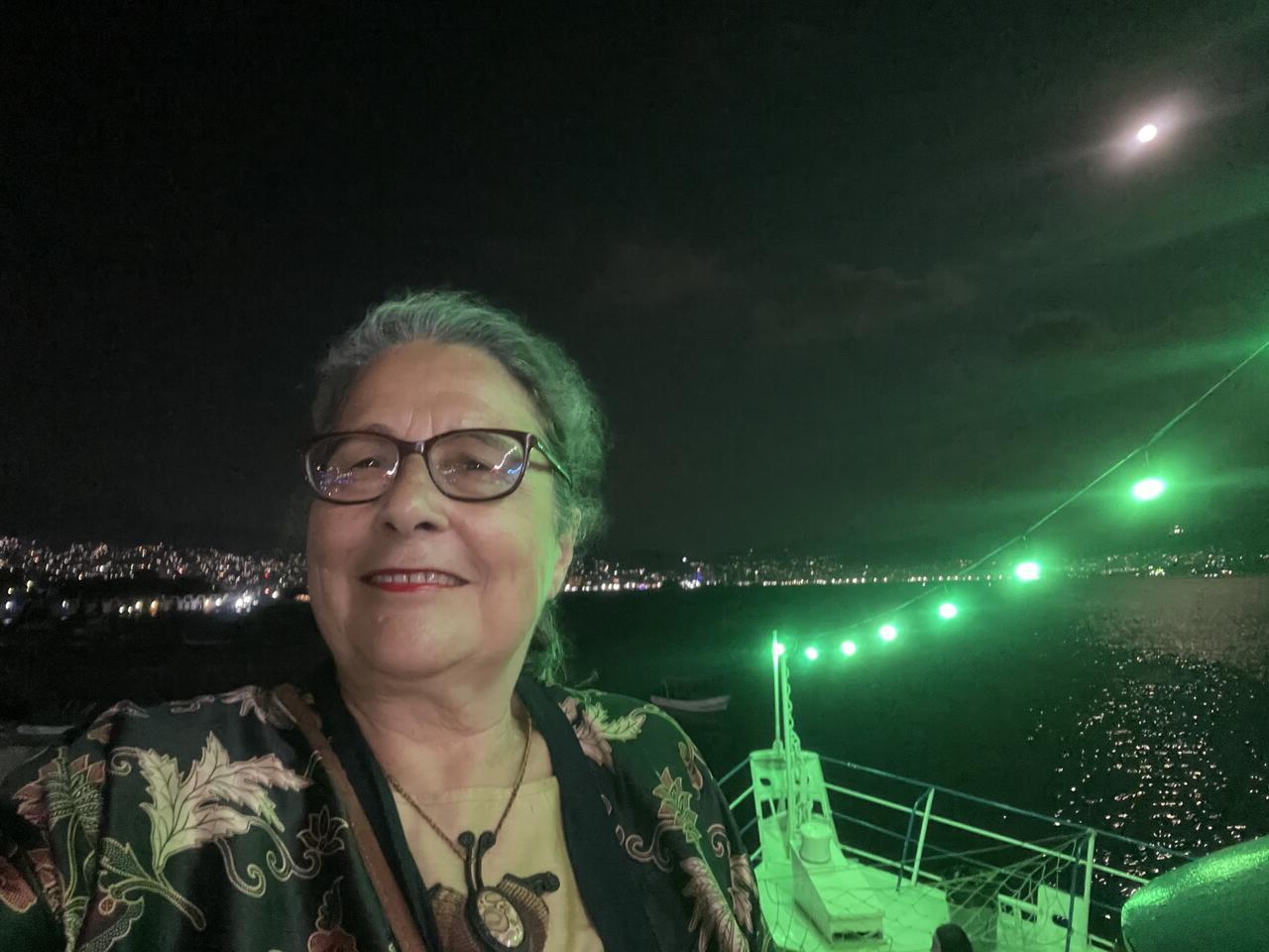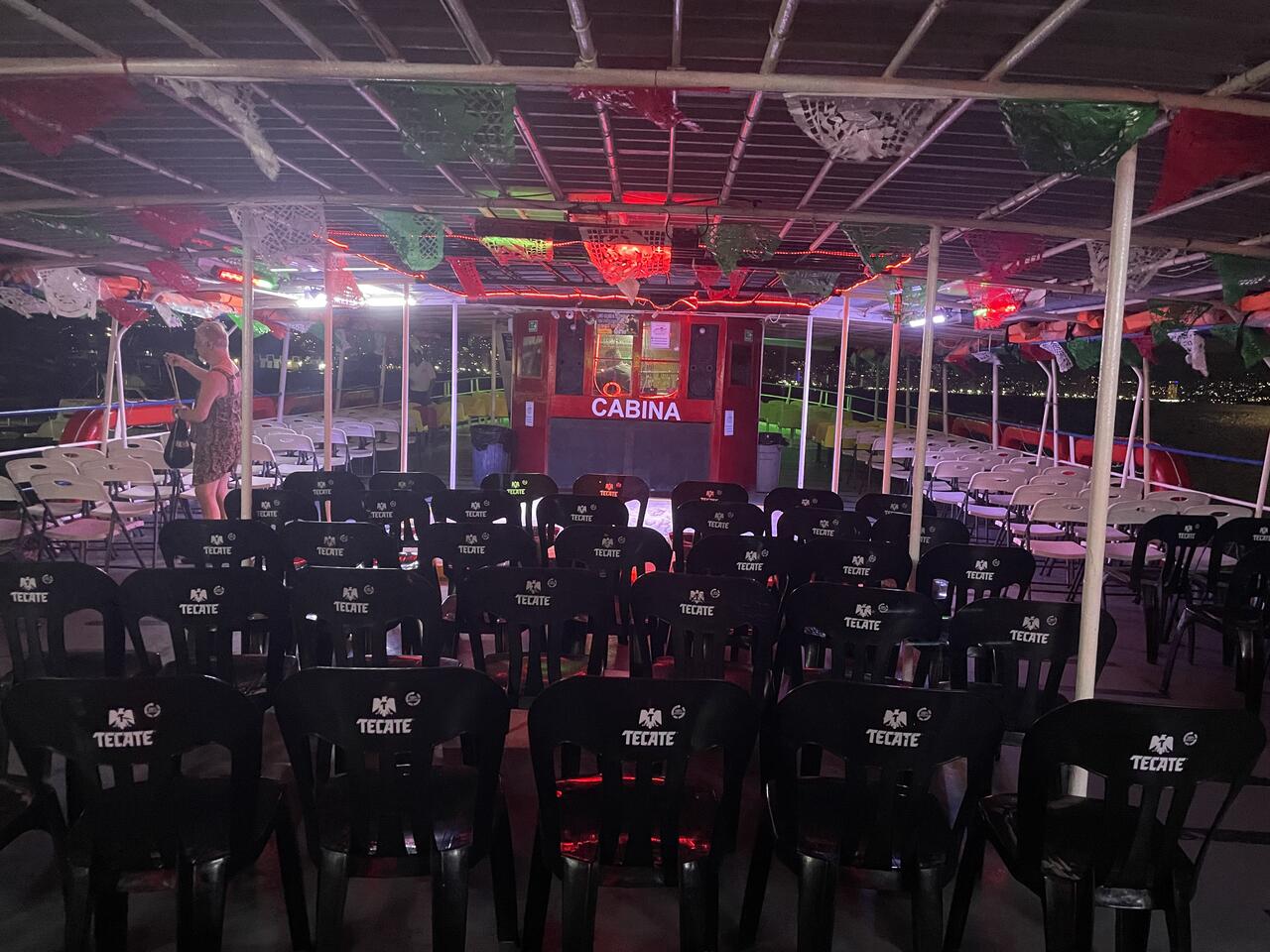 Wir sind unterdessen draussen in der Bucht, neben uns die Silhouette von Acapulco, über uns der Mond. Neben uns ein paar Möven, die wahrscheinlich die Mücken fangen, die vom Licht des Schiffes angelockt worden sind. Das Schiff hat leichten Seegang, denn wir sind knapp ausserhalb der Bucht. Nach einigem Zögern füllt sich die Bühne mit Paaren aller Altersstufen. Mexikaner lieben das Feiern. Sie lieben Partys. Frauen tragen blinkende farbige Diademe in den Haaren, kurze Röcke, während die Männer eher in schwarzen Hosen und farbigen Hemden eine gute Figur machen. Oder sie stossen ihre runden Bäuche stolz vor sich her, während sie für die Familie Getränke besorgen.