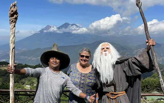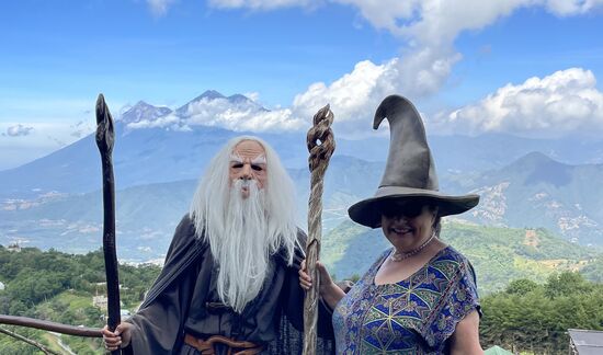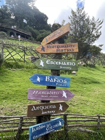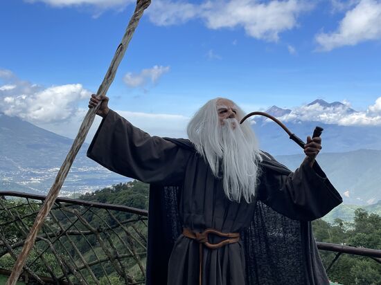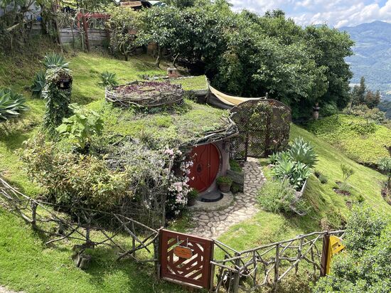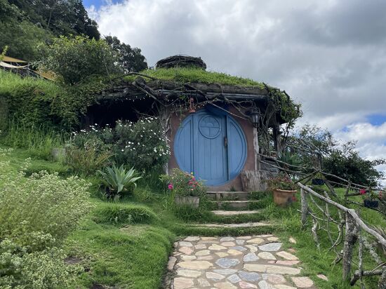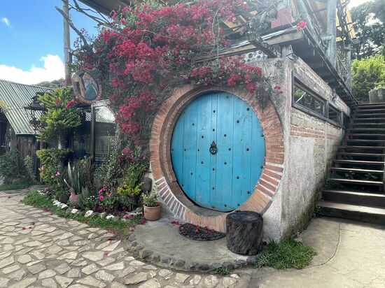Wir sind noch einmal gut 100 Meter höher gefahren. Hier oben hat jemand eine ganz neue Welt erschaffen. Im Stil von 'Herr der Ringe' wurden kleine Häuser mit runden Toren gebaut. Es sind Bungalows, man kann hier auch übernachten. Und es gibt verschiedene Aussichtspunkte, von denen man die Vulkane in ihrer ganzen Pracht sehen kann.