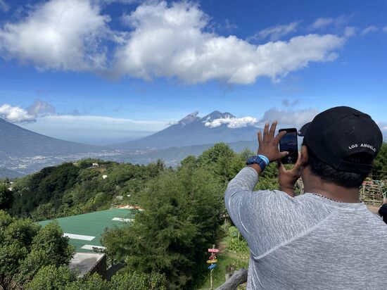 Siehst du da rechts, der Fuego hat soeben wieder eine Rauchwolke ausgespuckt. Tomas ist ganz begeistert und nimmt ihn gleich in den Fokus. Fängt an zu fotografieren. Es muss alles festgehalten werden. Uns, sich, den Vulkan, die Aussicht. Er schiesst Selfie um Selfie. Inzwischen weiss ich, was er damit macht. Er stellt die Selfies mit seinen Passagieren täglich in seinen Whatsapp-Status. Bleibt dadurch mit seinen neuen Freunden in Kontakt und verbreitet eine gute Stimmung.
