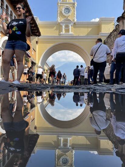 Beim Arco, wo schon wieder ganz viele Menschen am posieren sind, erinnert mich eine kleine Pfütze zwischen den groben Steinen an einen Fototrick, den ich vor kurzem zum ersten mal ausprobiert habe. Und es funktioniert tatsächlich. Wenn ich die Kamera ganz tief und gerade halte, ergibt sich eine wunderbare Spiegelung.