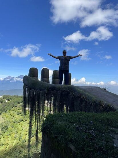 Wir gehen etwas weiter und kommen zu einer Hand Gottes. Diese Plattformen scheinen in Lateinamerika so richtig in Mode zu kommen. Im Norden von Peru bin ich zum ersten Mal einer begegnet und seither treffe ich immer wieder einmal auf so eine Konstrution. Sie sind aus Stahl, mit Holz oder Lehm verkleidet und bieten gute Bilder. Für unsere Sozial-Media-Generation.