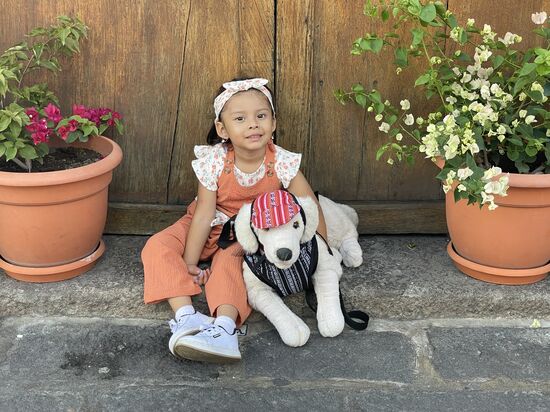 Das nächste Objekt ist ein kleines Mädchen, das mit einem Plüschhund posiert.