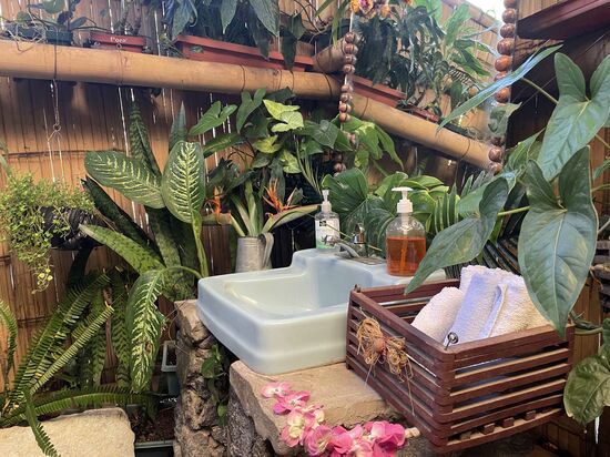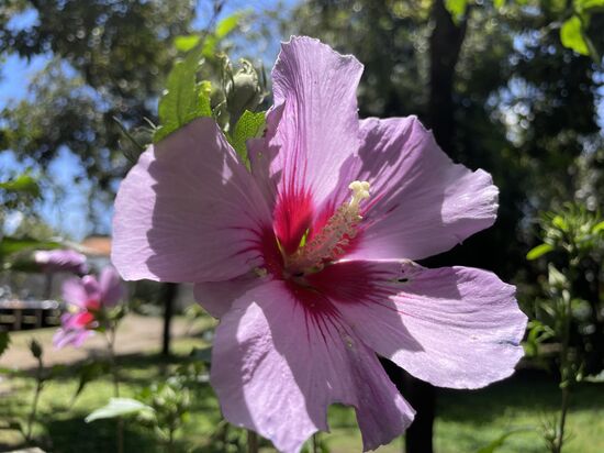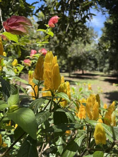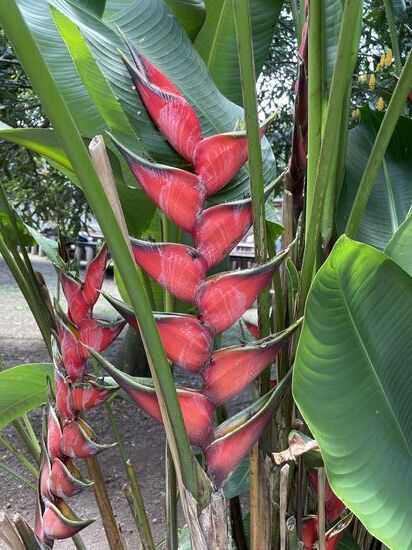 Das ist ein ruhiger Garten, mit Schattenplätzen unter hohen Macadamia-Bäumen und vielen exotischen Blumen.