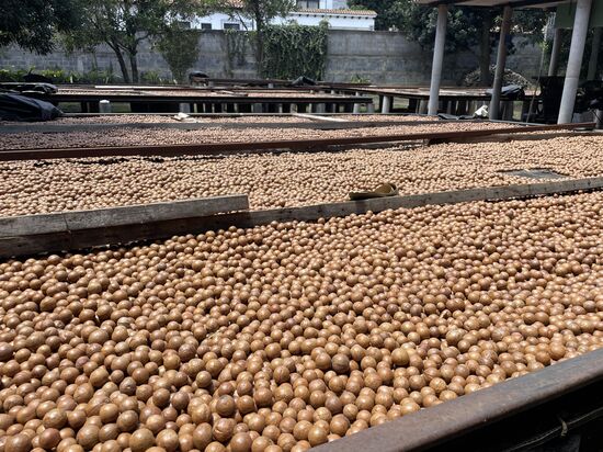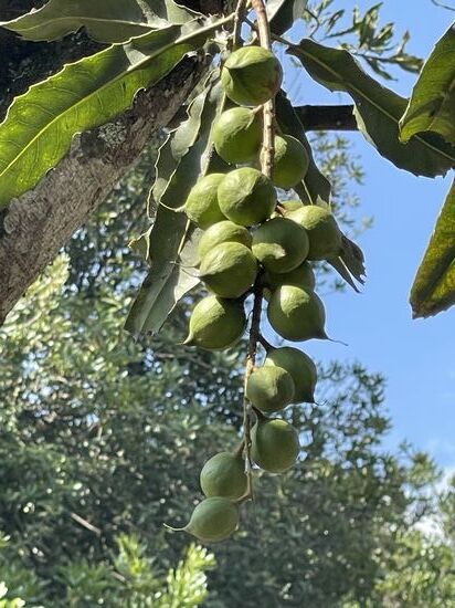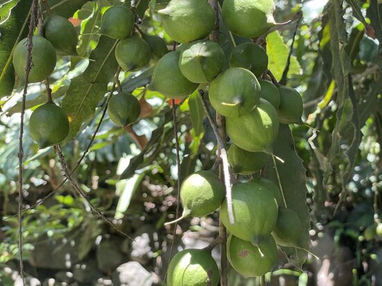 Macadamai-Nüsse haben die härteste Schale, die es gibt, Wenn ich ganze Nüsse kaufe, muss ich sie jeweils mit dem Hammer öffnen. Sie werden hier angebaut, an der Luft getrocknet, bis die Kerne im Innern trocken sind, dann werden sie in speziellen Geräten sortiert, geschält und kommen in den Verkauf im kleinen Laden. Es wird aber auch Kosmetik daraus gemacht, denn die Frucht ist nicht nur die härteste, sondern auch die fettreichste.
