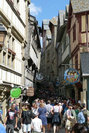 Mit jedem Kilometer, den wir zu Fuß zurücklegen und dem Berg näher kommen, steigt jedoch die Anzahl weiterer Menschen mit dem gleichen Ziel exponentiell an. Dichter und dichter wird das Gedränge, bis sich diese Myriaden an Touristen samt Hund und Kinderwagen in der einen, das Handy und das Eishörnchen (1 Kugel = 3 €) in der anderen Hand, in die engen Gassen von Saint-Michel ergießen und selbige verstopfen. Von vorne bremst, von hinten schiebt es, kein Weiterkommen an der schmalen Pforte, weil sich die Leute nicht darauf einigen können, wer von welcher Seite zuerst durchgehen soll. Endlich, nach unzähligen Trippelschritten, Rippenremplern, "Pardon", "Excusez moi" und "Du A…" werden wir wieder ausgespuckt und können die Flucht ergreifen. Gegen Mont-Saint-Michel ist Carcassonne ein lauschiges Plätzchen, nur Dubrovnik nach Festmachen von drei Kreuzfahrtschiffen kann da noch mithalten.