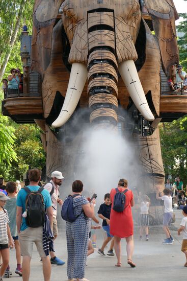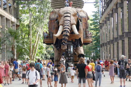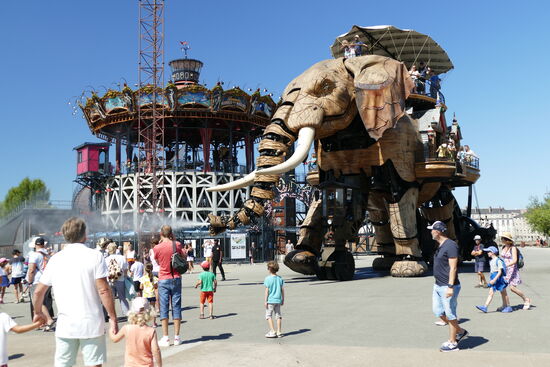 Wir sind in Nantes angekommen (nicht mehr Bretagne, sondern Pays de la Loire. Nantes fühlt sich selbst wohl aber bretonisch, also bekommt es seinen Platz in diesem Kapitel) und machen uns gleich mit dem Fahrrad vom Campingplatz auf in die Stadt, zehn Kilometer immer geradeaus entlang der Loire. Nantes ist für Frankreich wohl so etwas wie Hamburg für Deutschland: provinzielle Großstadt, in der man eine Woche Urlaub machen kann und immer noch nicht alles gesehen hat. Wir beschränken uns auf die Innenstadt rund ums Château, am zweiten Tag auf die Île de Nantes, eindeutig der spannender Teil des Stadtbesuchs – nicht zuletzt der Machines de l'île wegen: