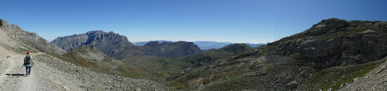 Unser Wanderziel hier oben ist das Chalet Real – ein großzügiges Fertigbauhaus im englischen Stil auf einer weiten Almwiese, das im Jahr 1912 errichtet wurde, um König Alfons XIII. während seiner Jagdaktivitäten in den Picos gebührend unterbringen zu können. Der Weg dorthin (ungefähr eine Dreiviertelstunde) ist leicht zu bewältigen, der Ausblick von dort oben auf die Berge rundherum einfach überwältigend. Wie schon im Tal, so sind auch hier oben Infos über Wanderwege, Richtungen und Ziele nur spärlich gesät. Allmählich aber keimt die Erkenntnis, dass wir uns bereits auf dem Weg befinden, der nach unten führt. Und da 1. der Weg sehr breit und sehr wenig steil ist, und wir 2. ja schon einen guten Teil davon – wie wir meinten – hinter uns gelassen haben, revidieren wir unseren Plan und streichen dem Kontrolleur geradewegs seine potentielle Einnahme. Wir werden bergab laufen!