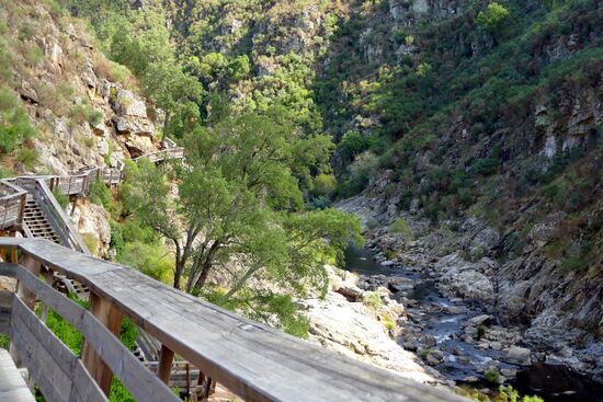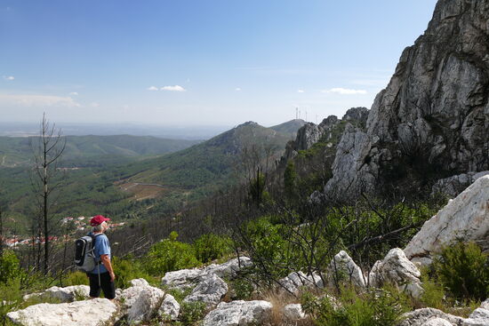 Über Unhais da Serra steuerten wir den Vía ferrata Serra do Muradal an, ein kurzer Klettersteig und gleichzeitig Teil des portugiesischen Appalachenweges. Wir hielten uns an die Beschreibung im Internet, da am Ausgangspunkt keinerlei Beschilderung vorhanden war. Es hieß, dem GR38 zu folgen, dann komme man zum Einstieg – also folgten wir. Dass der GR38 sich aufgabelt und einmal links, einmal rechts um den Felsen herumführt, wurde nicht erwähnt. Unschwer zu erraten, welchen Weg wir genommen haben. Erst am hinteren Ende trafen wir dann auch auf eine Beschilderung, die den richtigen Weg zum Klettersteig wies – da hatten wir dann aber keine Lust mehr! Immerhin kamen unsere Helme, Gurte und Klettergeschirr mal an die frische Luft - und außerdem war es eine schöne Wanderung.