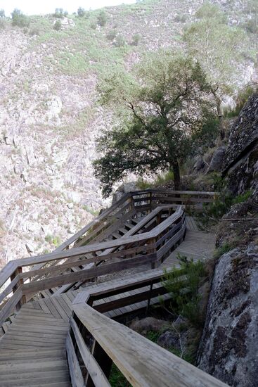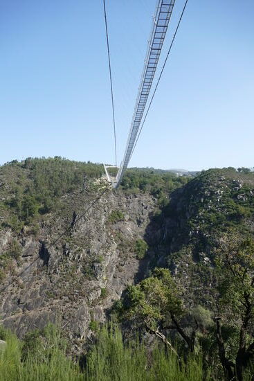 Der Passadiços do Paiva. Ein Wanderweg für Leute, die gerne Treppen steigen. Der Weg folgt fast immer dem Lauf des Rio Paiva und ist rund acht Kilometer lang. Hier hat man beinah über die gesamte Strecke einen Holzsteg gebaut, der einen zu Beginn (oder zum Ende, wenn man von der anderen Seite kommt) zunächst rund 500 Treppen hinauf und anschließend 600 wieder hinunter führt. Dazwischen ein Wasserfall und die "516 Arouca", die längste Fußgänger-Hängebrücke der Welt, die leider nicht zum Weg gehört und nur unterkreuzt wird – dennoch beeindruckend. Am Ende wartet ein kühles Bier in einer kleinen Bar direkt am Fluss und ein Taxi, das uns zum Ausgangspunkt zurückbringt. Nur für einen kurzen Moment hatten wir darüber nachgedacht, den Weg auch wieder zurückzugehen – so wie man darüber nachdenkt, einmal in einem Tatort mitzuspielen, König Charles kennenzulernen oder zum Mond zu fliegen.