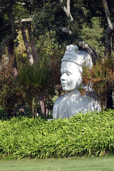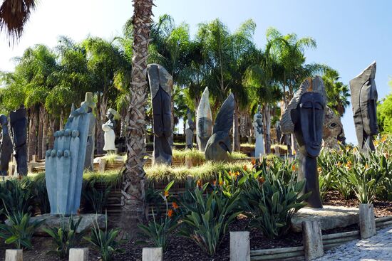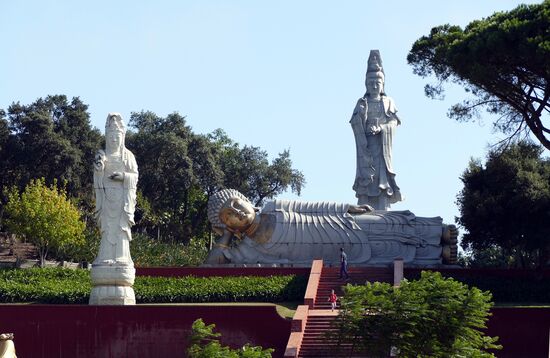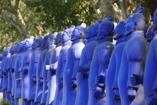 Am Tag darauf haben wir es zunächst auch nicht sonderlich weit, um an unser nächstes Ziel zu kommen: Bacalhôa Buddha Eden. Der vom Obstverkäufer zum Milliardär gewordene Joe Berardo beschloss 2001 als Reaktion auf die Zerstörung der Riesen-Buddhas von Bamiyan, einen riesigen Friedensgarten anzulegen, den er mit in China gefertigten Buddhastatuen ausstattete. Er ist der größte fernöstliche Garten Europas und scheint noch immer erweitert zu werden – derzeit ist ein weiterer See in Bau. Inzwischen kann man dort neben Buddhas auch Pagoden sehen, Terrakotta-Statuen (Kopien der Terrakotta-Armee von Xi’an, ganz in Blau!), hunderte von afrikanischen Skulpturen (ich bin mir sicher, dass es sich hier um den größten Skulpturengarten afrikanischer Kunst weltweit handelt) und zeitgenössische Skulpturen berühmter Künstler.