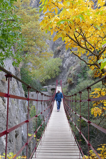 Wir machen uns auf zu einer Wanderung am Fuße der Sierra Nevada entlang des kleinen Río Monachil. Nachdem wir auch hier mal wieder den richtigen Einstieg verpasst haben, treffen wir eineinhalb Kilometer später wieder auf den richtigen Weg, ein schmaler, matschiger Trampelpfad direkt neben dem Flusslauf. Es geht rauf und runter, im wahrsten Sinn des Wortes über Stock und Stein. Gottlob gibt es drei kleinere Hängebrücken an den Stellen, wo man den Bach queren muss, so bleiben uns zumindest nasse Schuhe erspart. Vor einer längeren vierten Hängebrücke ist ein 4x4 Meter hohes Holzschild errichtet, das darüber informierte, dass die Brücke nur maximal 4 Personen trägt. In großer Schrift mit mehreren Ausrufezeichen. Man weiß da nie so genau: übertreiben die es jetzt oder sollte ich nochmals die genauen Konditionen der Lebensversicherung checken?